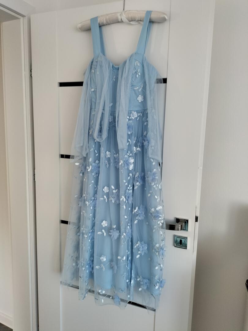 Tanio sprzedam sukienkę firmy Lily Mcbee elegancką, wieczorową o rozmiarze M w kolorze błękitnym. Sukienka wygląda przepięknie i jest w stanie doskonałym.