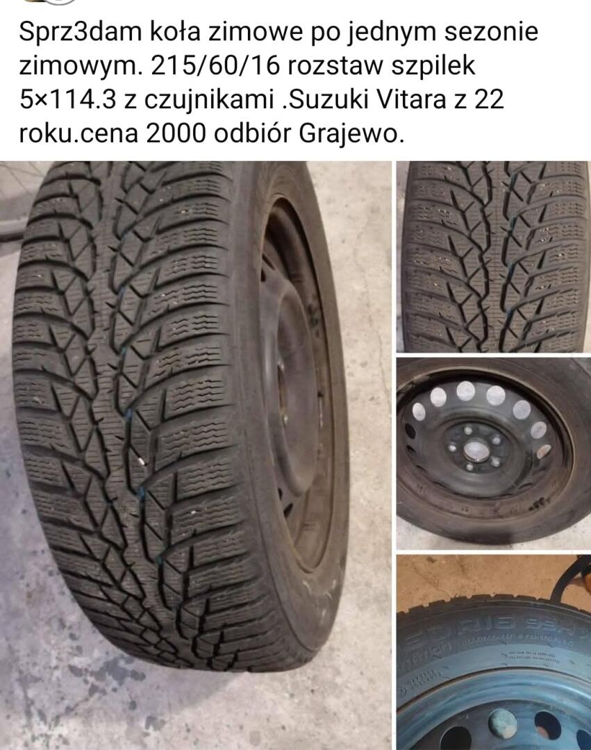 Sprzedam komplet k?ł zimowych po jednym sezonie kupione w salonie do Suzuki Vitara 215/60/16 rozstaw szpilek 5×114.3.Cena do negocjacji